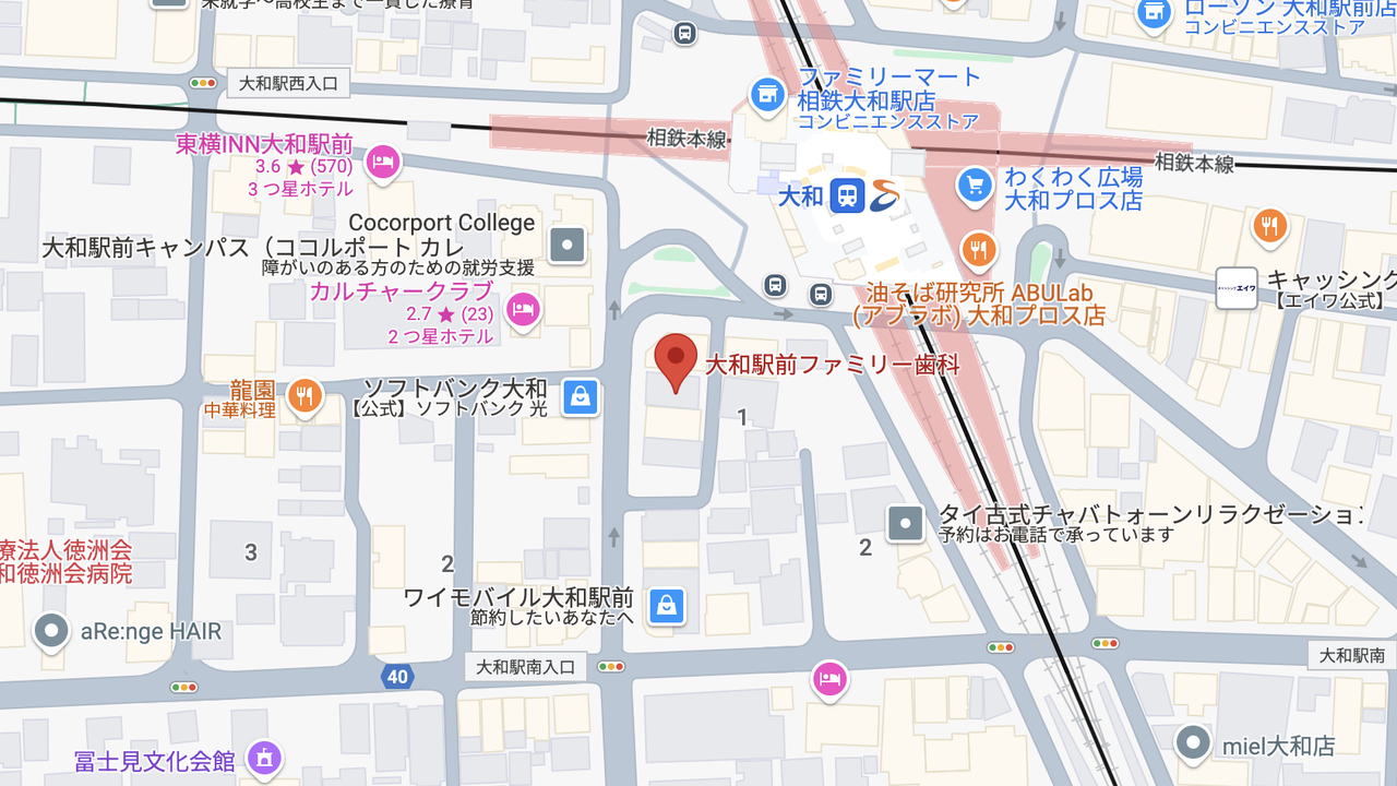 小田急江ノ島線・相鉄線「大和駅」の改札から徒歩わずか1分。雨の日でもほとんど濡れることなく通院できます。駅前の好立地なので、お仕事帰りやお買い物のついでにも立ち寄りやすく、治療を途中で止めてしまうリスクを減らせるはずです。