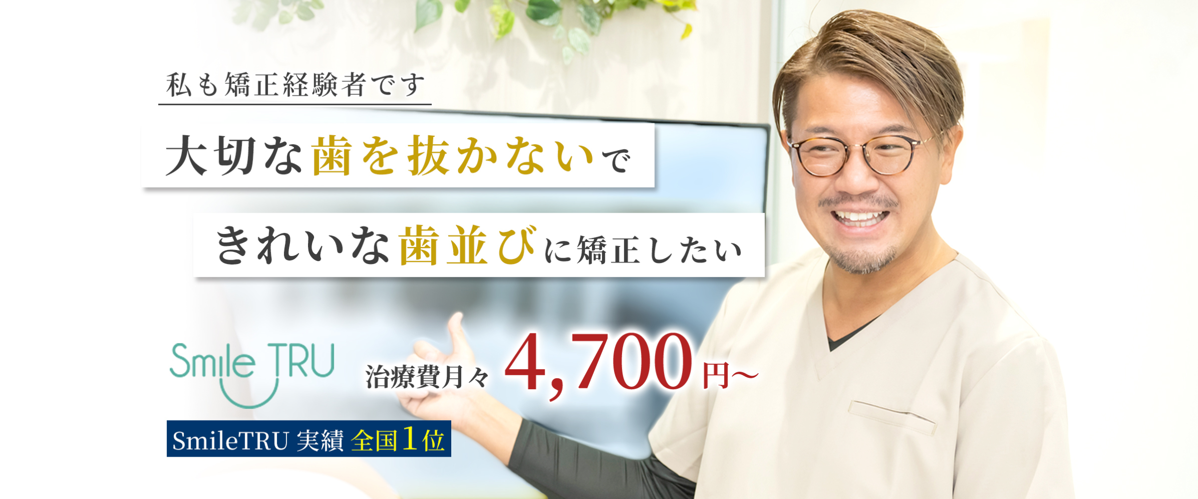 歯を抜かずに理想の歯並びを手に入れたい——そんな願いをお持ちのあなたへ、私は矯正経験者として、そしてマウスピース矯正Smile TRUで全国1位(※1)の歯科医師として、歯並びに合わせた治療法をご提案します。費用は月々4,700円〜9,200円です(※2)。