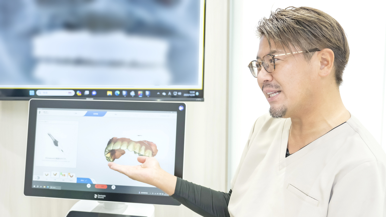 理事長がお口の診察を行い、続いて最新の口腔内スキャナーを使って、患者さまの歯をスキャンします。